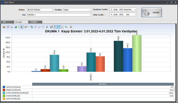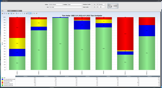 Each color has a meaning on these screens and provides ease of understanding for the user. In addition, operations can be performed on the screens opened by clicking on the boxes on these screens (such as entering the reason for the stop or dividing the time).